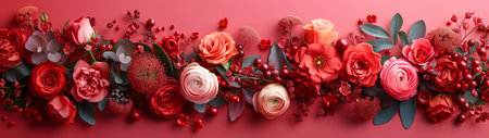 A stunning display of fresh red and white flowers accompanied by lush greenery set against a soft pink background. Perfect for seasonal decor and floral designs.