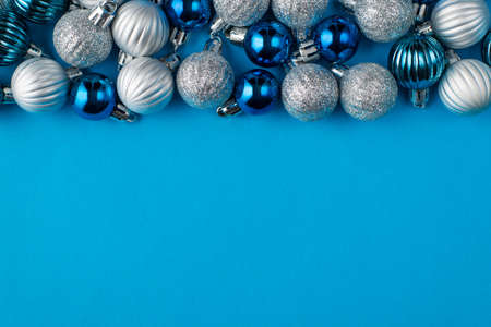 Christmas multicolored balls and snowflakes on a blue background. Copy space