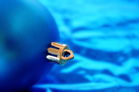 Close up of a blue Christmas ornament with a blue background. Focus is on the cap of the ornament. Copy space available.