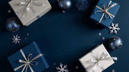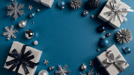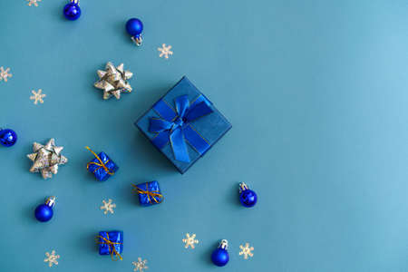 Blue christmas background of gift box and snowflake decorations and balls of blue and silver color. Winter holidays concept. Flat lay, top view, copy space.