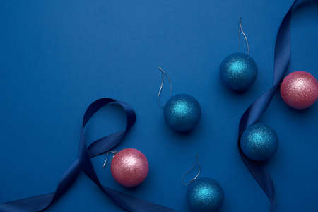 silk ribbon and pink and blue shiny Christmas balls on a blue background, festive backdrop for Christmas and New Year