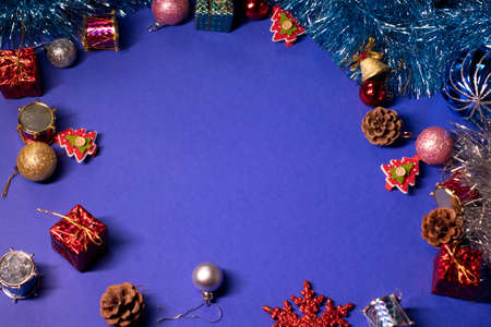 Christmas greeting card. Festive decoration on blue background. New Year concept. Copy space. Flat lay. Top view.