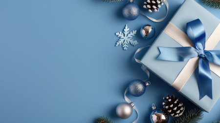 A beautiful blue gift box adorned with a silky ribbon sits elegantly against a soft blue background. Surrounding decorations create a festive atmosphere.