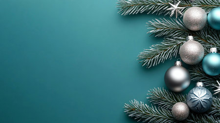 Christmas Banner With Silver, Blue Ornaments, Fir Branches On Teal Background,. Copy Space