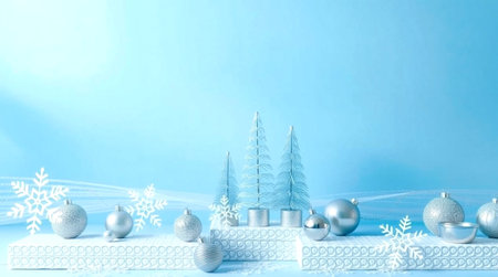 A captivating arrangement of blue and white holiday decorations including ornaments, stars, and snowflakes, creating a festive winter vibe.