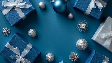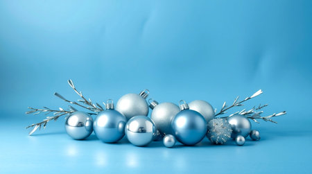 A festive arrangement of blue and silver Christmas baubles and pine branches on a deep blue surface, creating a sophisticated holiday theme.