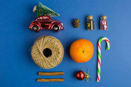 Christmas composition. Toy car, mandarins, candy on blue trendy background. Festive backdrop for projects. Flat lay style. Top view. Color of the year
