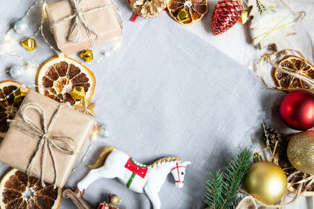 Christmas and New Year holiday composition. Flat lay, top view, copy space.