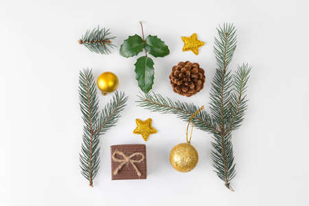 top view of Christmas decoration on white background. Pine fir, gift box, bauble, star.