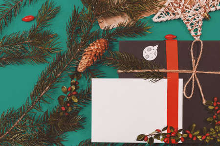 Top view of Christmas background design concept with fir tree branch, snowflake, pine cones and blank card.