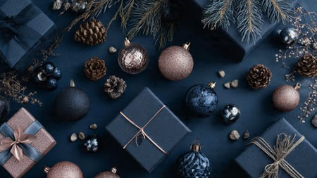 A beautiful flat lay of holiday decorations featuring pine branches, elegant gift boxes, and colorful ornaments. Perfect for capturing seasonal cheer and warmth.