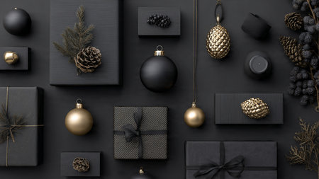 A dramatic arrangement of ornaments with rich black surfaces and gold pops.