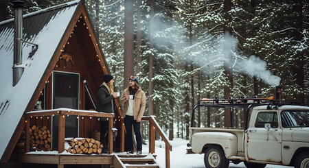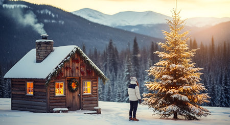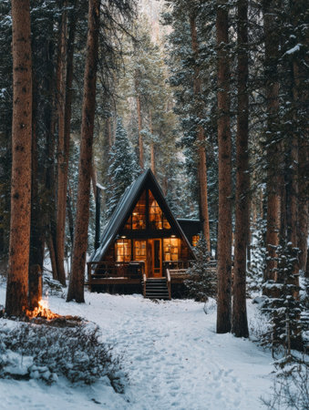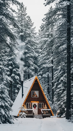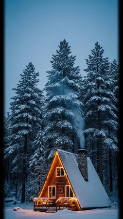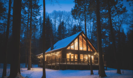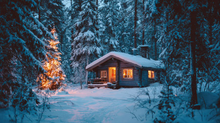 Cozy cabin adorned with twinkling lights stands amidst snowy forest, creating magical winter scene. serene atmosphere evokes feelings of warmth and tranquility