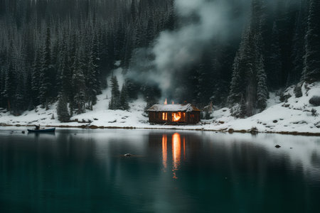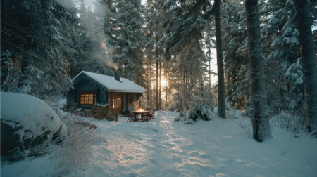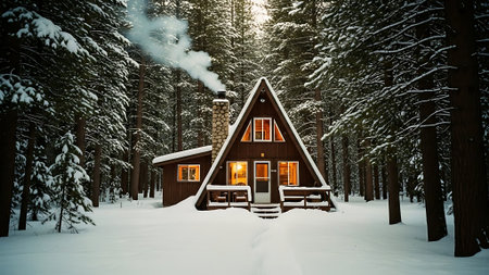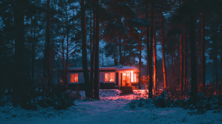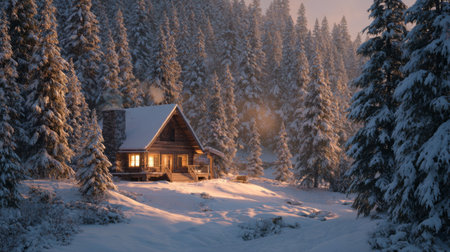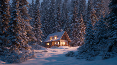 A picturesque cabin nestled in a snow-covered forest, radiating warmth from glowing lights. This scene evokes a sense of tranquility and serene beauty in winter.