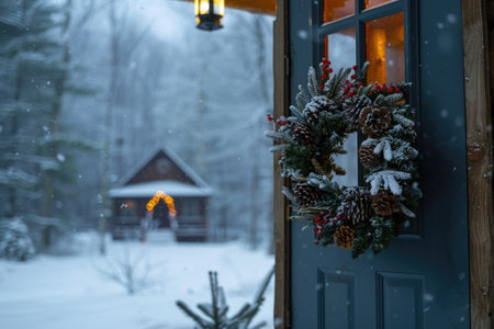 A cozy log cabin with a festive wreath adorning its door, nestled in a winter landscape, A cozy log cabin in a forest with a Christmas wreath on the door, AI Generated