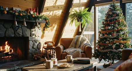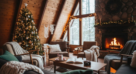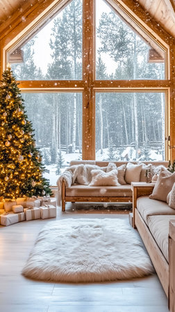 Experience the warmth of a cozy winter living room adorned with a beautifully decorated Christmas tree, inviting fireplace, and scenic view. Ideal for holiday inspiration.