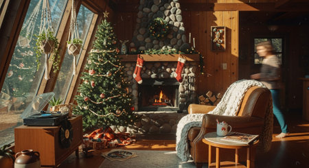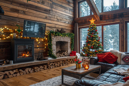 An inviting interior shot showcases a log cabin living room, centered around a stone fireplace. Warm tones from the wooden structure and the fire's glow contrast with the cool outdoor view through large windows. The scene includes a sofa, Christmas tree, and offers potential use for home design or lifestyle themes.