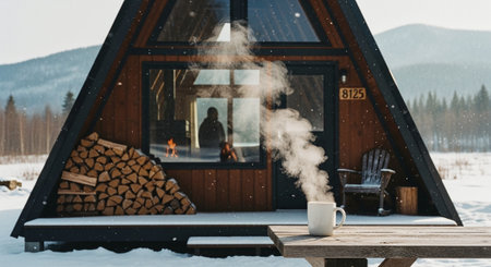 A cozy cabin in a snowy landscape, with smoke rising from a mug on a wooden table, firewood stacked beside the cabin, and mountains in the background