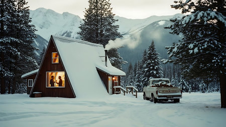 A cozy cabin stands snow-covered amidst tall evergreen trees in a serene winter wonderland. Mountains loom in the background, creating a peaceful atmosphere.