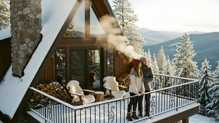 Couple in love standing on the terrace of a wooden house in the mountains in the winter