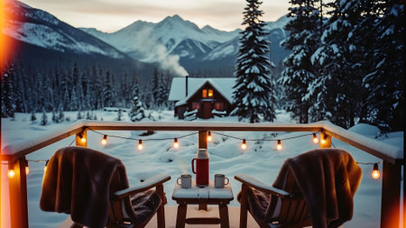 Wooden cabin on a snowy winter evening, decorated with festive string lights for the holidays