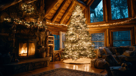 A decorated Christmas tree stands in the corner of a rustic cabin, glowing with lights, while a fireplace warms the room.
