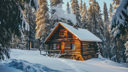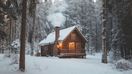 Cozy cabin in the woods with smoke rising from the chimney, surrounded by snow