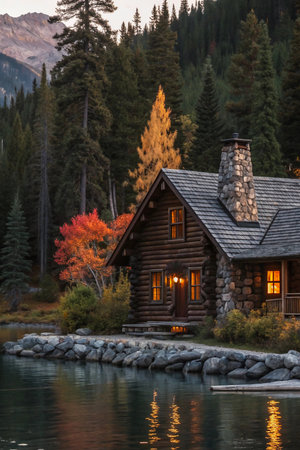 A rustic log cabin with warm lights glows beside a calm lake, surrounded by vibrant autumn foliage and dark evergreen trees.