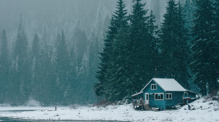 A charming cabin rests beside a tranquil lake, surrounded by snow-covered pine trees under a soft snowfall. This serene winter landscape evokes feelings of peace and escape.