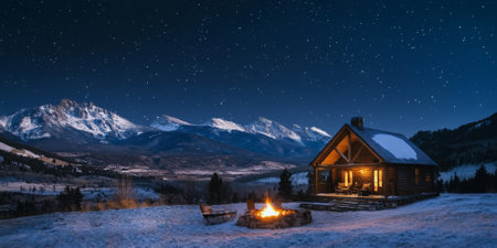 A serene mountain retreat with a wooden lodge, a crackling fire pit outside, and snow-covered peaks surrounding the valley under a clear starry sky. The cozy and peaceful setting feels inviting.