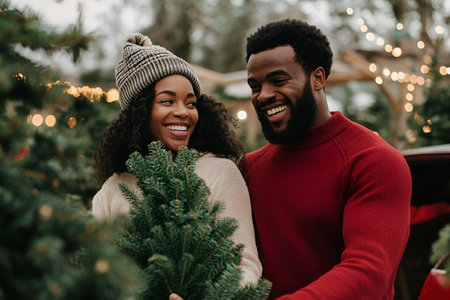 A cheerful African American couple dressed in cozy sweaters and a winter hat, choosing a Christmas tree surrounded by holiday decorations and lights.