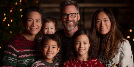 A joyful family capturing a heartfelt selfie in a beautifully decorated festive environment filled with colorful lights, showcasing love and connection during the holiday season.