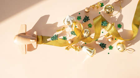 Happy new year and Merry christmas. Wooden children's plane with christmas elements and satin ribbon on a beige background