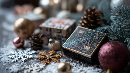 A rustic Christmas scene featuring ornaments, pinecones, wrapped gifts, and seasonal decor on a wooden background. Ideal for holiday, festive, and seasonal themes.