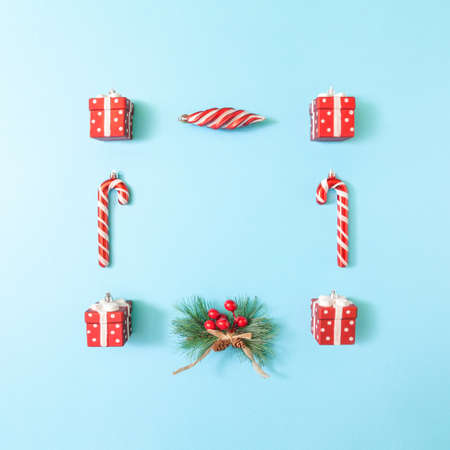 Creative square frame made of red Christmas decorations on pastel blue background. Winter holiday template with copy space.