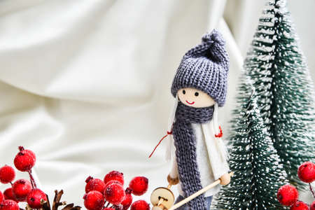 Christmas composition with doll skiing and fir trees festive decorations on silk. Christmas or New Year greeting card. Copy space. Trendy champagne color