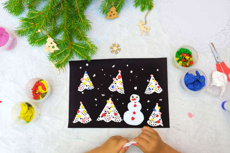 Child making a greeting card Christmas paper and plasticine craft. Craft for children. Nice greeting card with a Christmas snowy night with fir trees and snowman. Top view