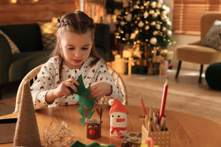 Cute child holding felt fir tree at home. Making christmas decor