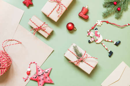 Christmas or New year gift packing. Holiday decor concept. Top view