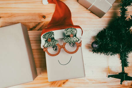 Gift box wearing Christmas glasses and Santa hat with smiling face on the table near the Christmas tree at home. Happy New Year and Merry Christmas.