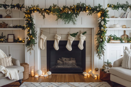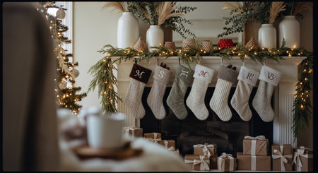 A cozy holiday scene featuring a decorated fireplace with stockings hung, adorned with greenery and lights, surrounded by wrapped gifts and a Christmas tree in the background
