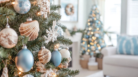 A stunning Christmas tree adorned with blue and natural ornaments creates a cozy and inviting atmosphere in a decorated living room. Perfect for festive inspiration.