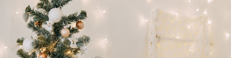 Christmas decorations on the branches fir, sparkling and fairy background. Red and white New Years Christmas ornaments on the tree, glass balls and garlands in the house.web banner