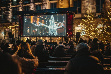 Crowd enjoying a festive film at a christmas market illuminated by tree lights
