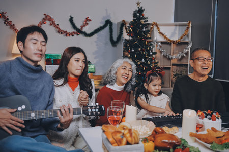 Friends both man and woman or young people are gathering for Christmas and New Year holiday, singing, smiling at each other, and celebrating the happiness festival