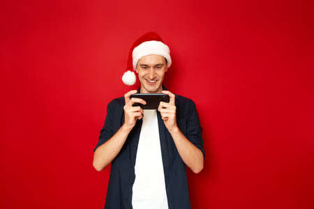 young man in casual clothes blue shirt New Year hat Santa Claus watching video on his phone playing mobile game in app highlighted with red background, concept - people, technology, entertainment
