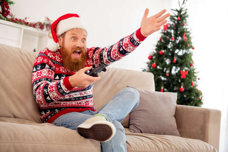 Photo of happy funky screaming male playing playstation win game scream shout wear santa claus sit sofa couch at home