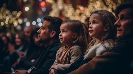 an audience girls and fathers in a warm, cozy atmosphere, watching an event during a nighttime gathering.High resolution AI generated
