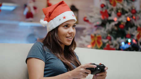 Woman playing video games with controller on tv console and feeling happy on christmas eve. Festive adult enjoying online play with joystick on television screen, having fun on holiday