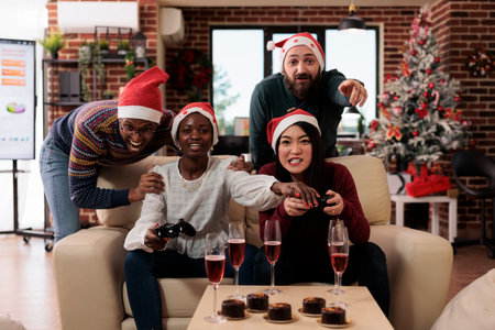Diverse coworkers enjoying gaming competition at xmas party, celebrating christmas eve festivity with colleagues. Playing online game at winter holiday event with festive ornaments and wine.